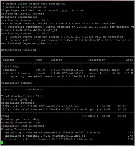 - " yum install vzkernel.x86_64 " find and installs only 2 packages (no i686 pckgs!) - vzkernel x86_64 2.6.32-042stab055.12 and vzkernel-firmware noarch x86_64 2.6.32-042stab055.12 from openvz-kernel-rhel6 repository.
