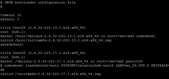 - System: CentOS 6.2 , kernel 2.6.32-220.7.1.el6.x86_64, RAID1 (md0 swap; md1 /boot; md2 all the rest)