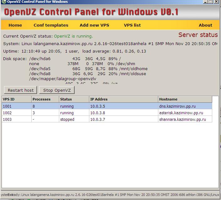 Реализованные функции: запуск/остановка openvz, редактор конфигурации для шаблонов VPS (ve-vps), управление VPS (создание/удаление, запуск/остановка, установка основных параметров, паролей, устанока/удаление рпм-пакетов в VPS)