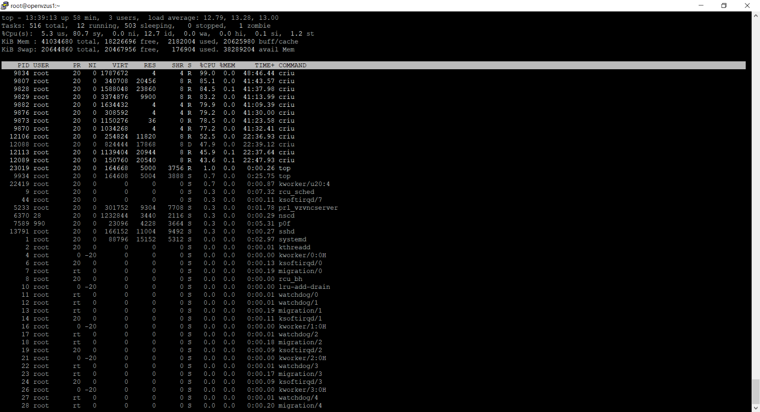 12113 root 20 0 1139404 20944 8 R 52.5 0.1 19:49.99 criu